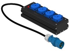 Дистрибьютор питания ТТС туровый на 4 розетки Schuko 16A. Ввод через 2м резиновый кабель 3G4, вилка CEE 3x32A IP44 обрезиненная. Индикатор ввода 220В. Корпус напольный из фирменного алюминиевого профиля и 1,5 мм стали.