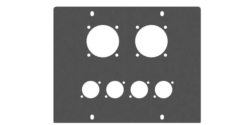 Установочная пластина для лючка КРC-L4. 2 отверстия под розетки Schuko и 4 отверстия под разъемы XLR D-типа.  Габариты 203х160 мм. "Чистые" габариты для установки разъемов: 203х122 мм.