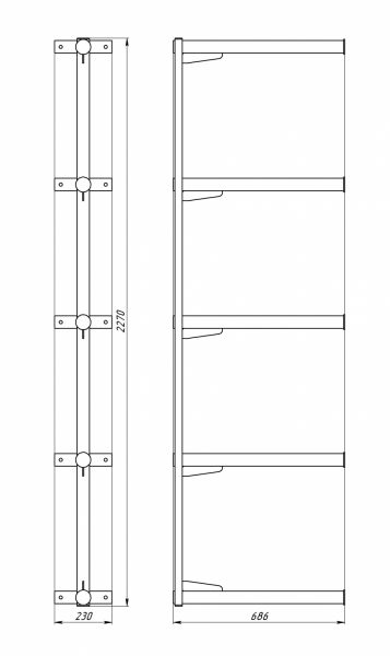 • Высота L=2270 мм, пять консолей диам. 50 мм, длина 650 мм., шаг между консолями 550 мм.