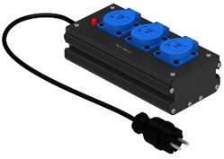 Дистрибьютор питания ТТС туровый на 3 розетки Schuko 16A. Ввод через 2м резиновый кабель 3G2.5, вилка Schuko 16А обрезиненная. Индикатор ввода 220В. Корпус напольный из фирменного алюминиевого профиля и 1,5-мм стали.