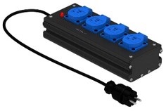 Дистрибьютор питания ТТС туровый на 4 розетки Schuko 16A. Ввод через 2м резиновый кабель 3G2.5, вилка Schuko 16А обрезиненная. Индикатор ввода 220В. Корпус напольный из фирменного алюминиевого профиля и 1,5-мм стали.